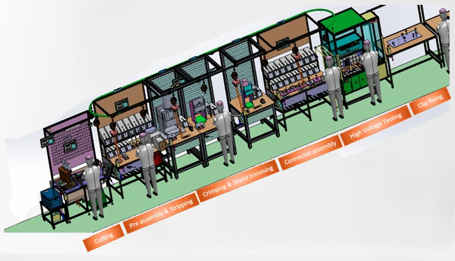 The entire harness will be processed, assembled and tested in single piece flow. The entire processing data like Strip length, Crimp dimensions, USW parameters, IR test, Continuity test, etc., will be recorded and the entire process will be in semi-automatic mode with 100% traceability. Any Rework / Rejections will be stored in the system with proper records. Maintenance and Quality checks are digitalized with ANDON displays to check the line out puts.